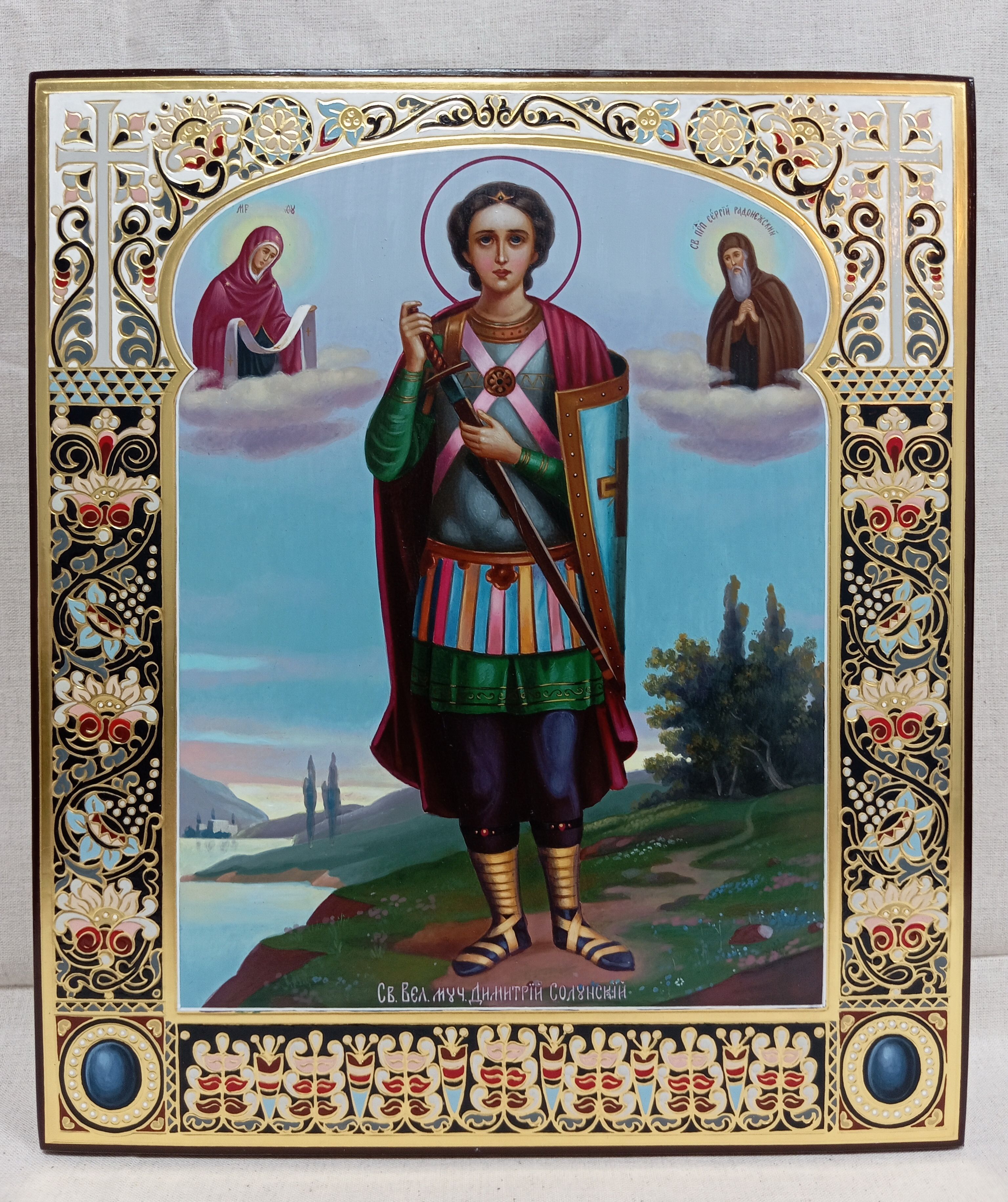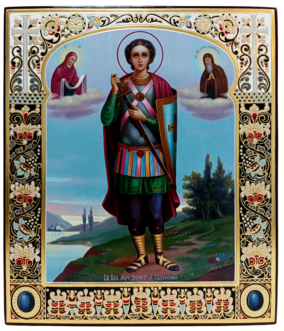 Димитрий Солунский (Фессалоникийский), Мироточивый, Святой великомученик с предстоящими образами Пресвятой Богородицы "Покров" и Святого Преподобного Сергия Радонежского.