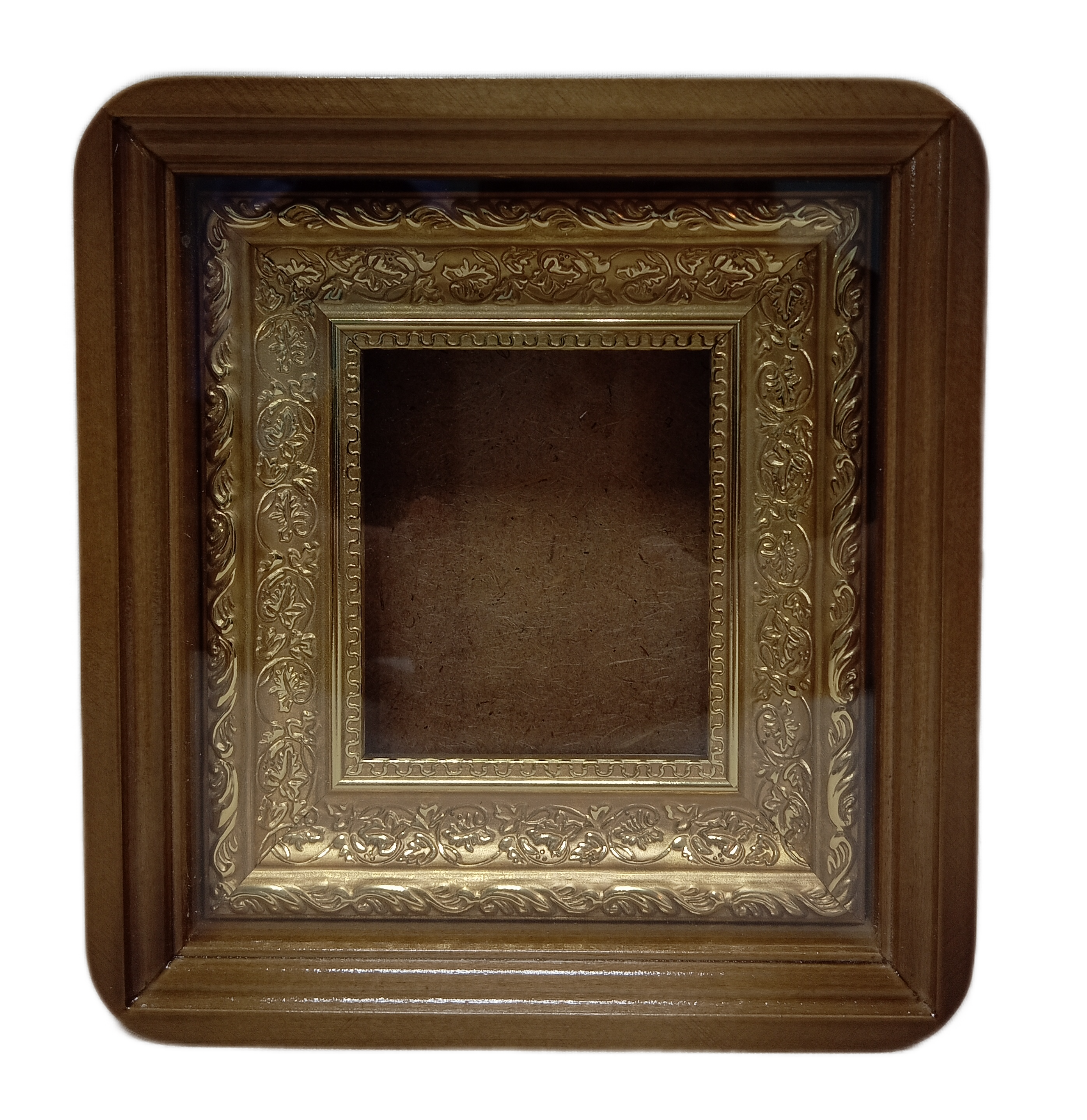 Киот деревянный с багетной рамой "под золото", для иконы формата 9х10,5см.